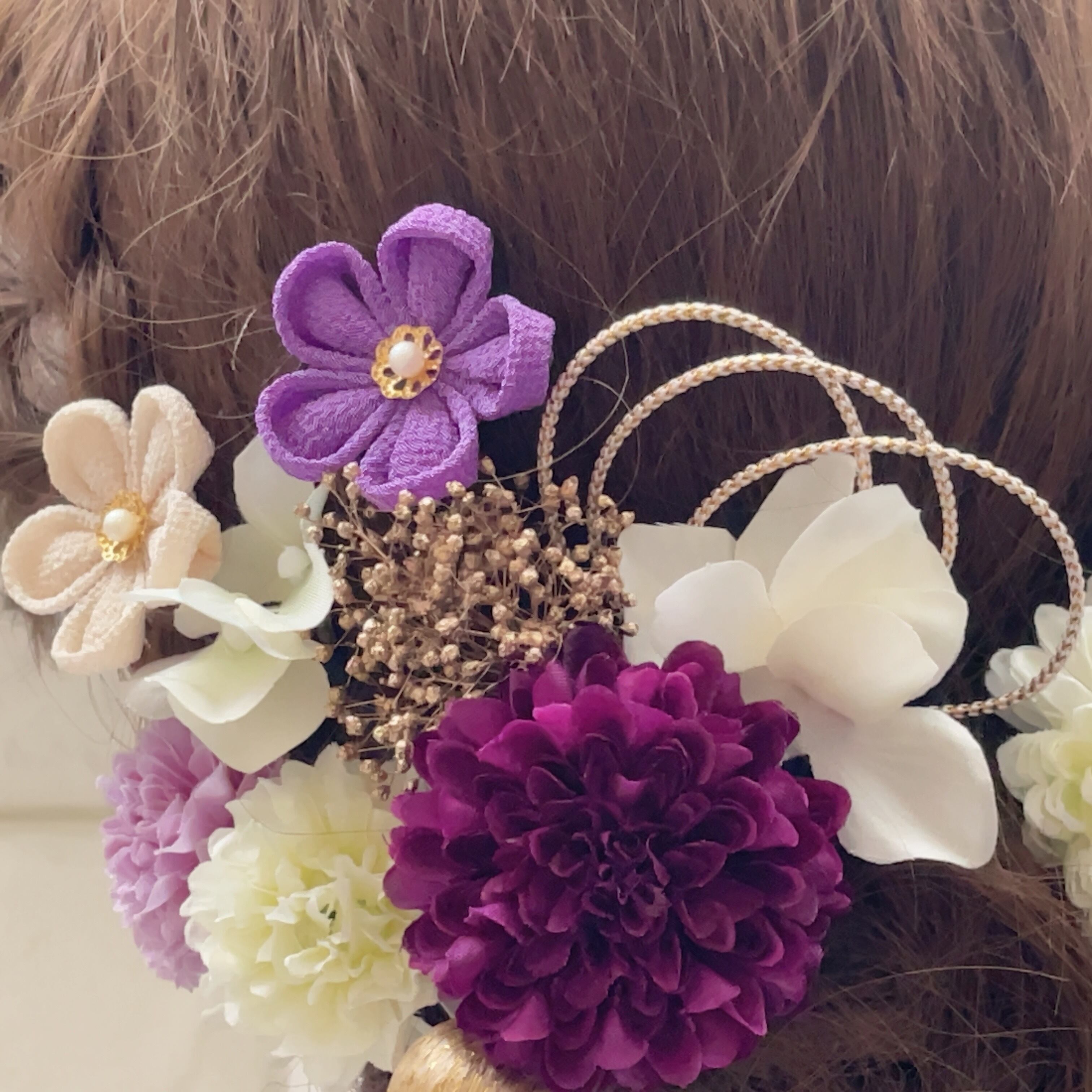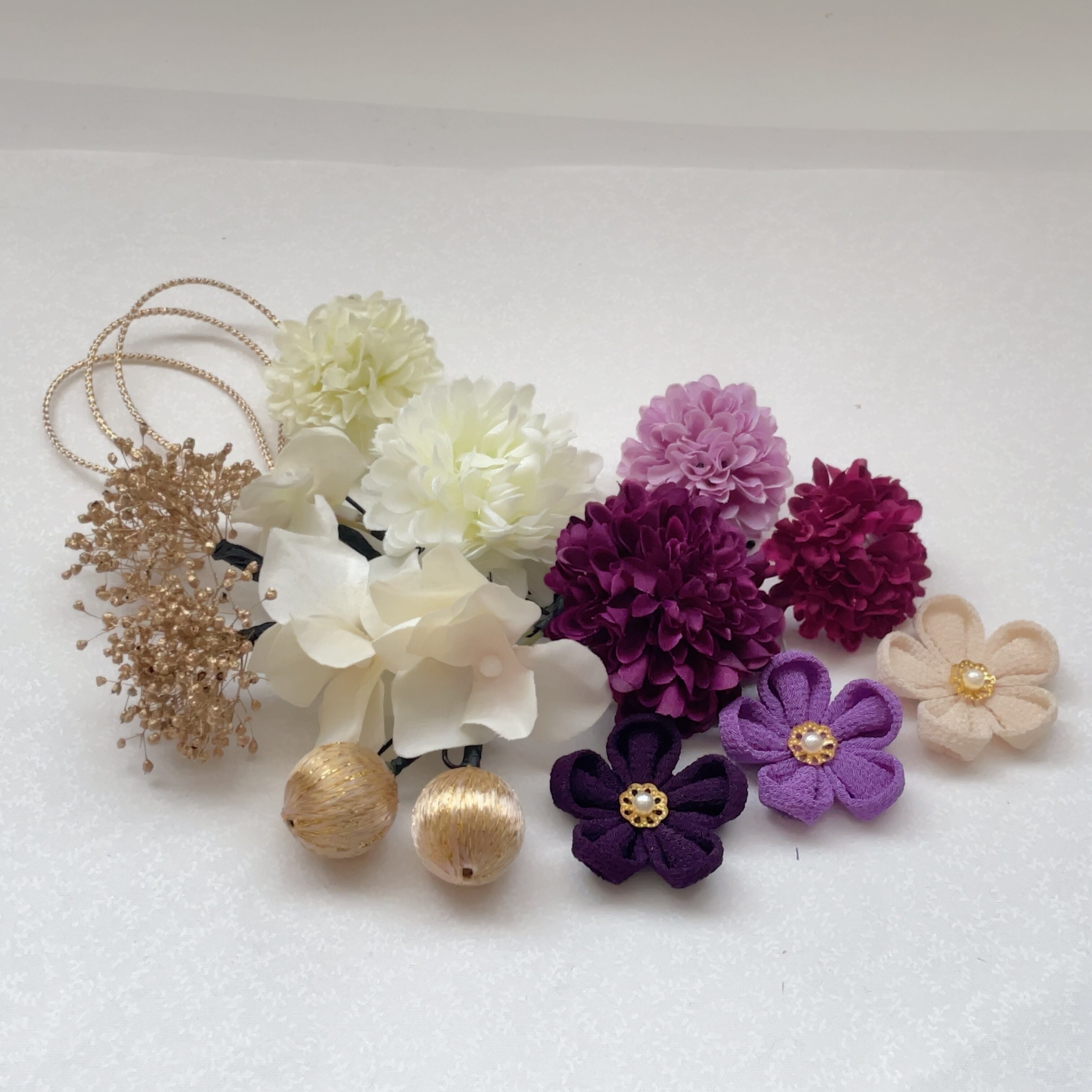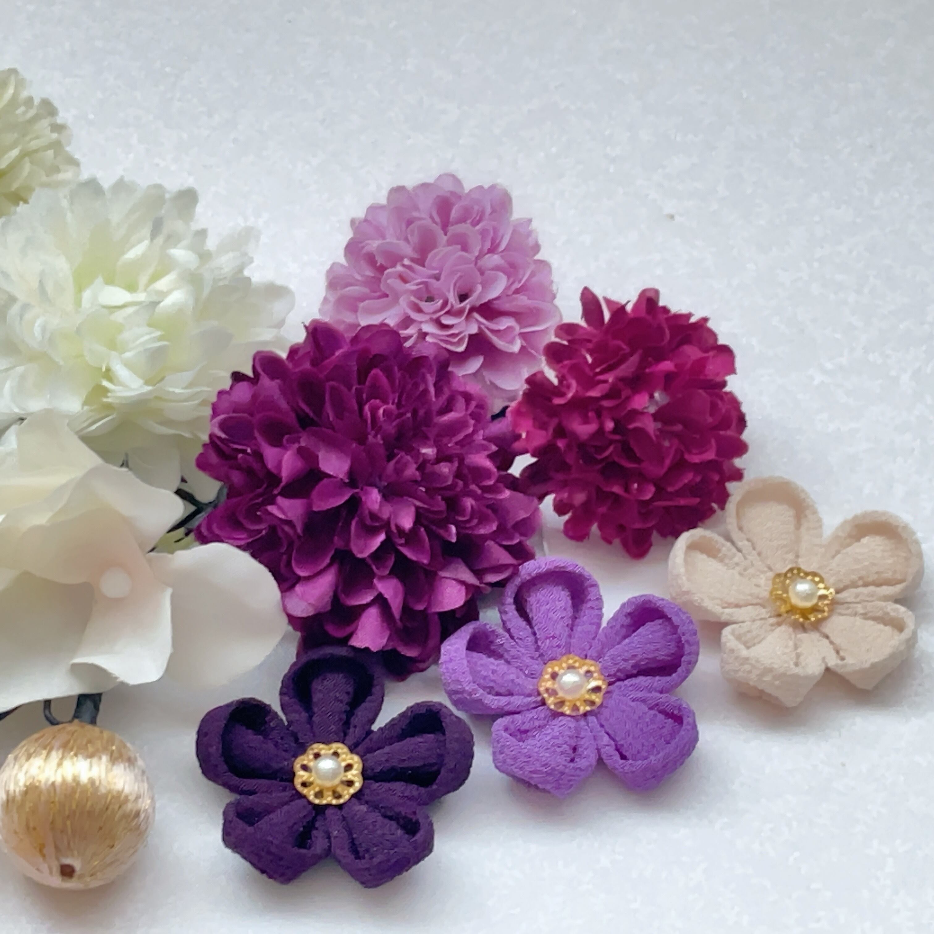 つまみ細工小花 、アーティシャルフラワーは一つ一つUピン、ダリアはクリップピン仕上げですので、髪型にあわせて飾りやすくお使いいただけます。