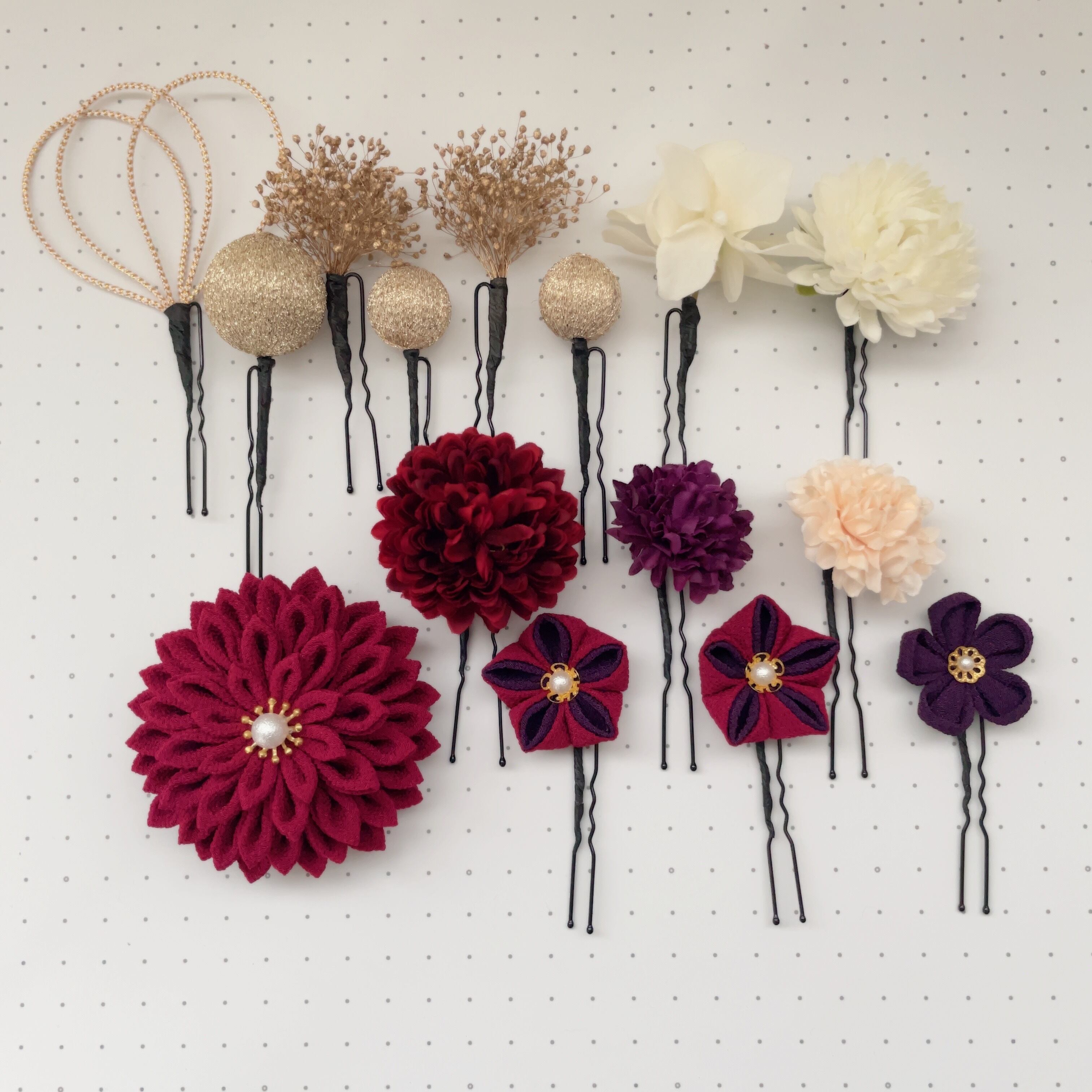 つまみ細工小花 、アーティシャルフラワーは一つ一つUピン、ダリア(大花)はクリップピン仕上げですので、髪型にあわせて飾りやすくお使いいただけます。